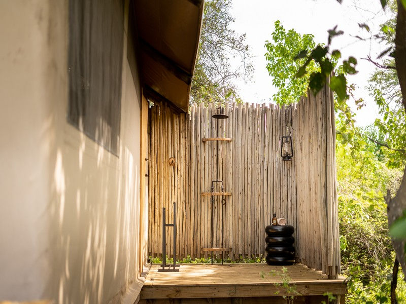 At the heart of the camp is a relaxed lounge and dining area, set beneath thatch and finished with a subtle mix of old-world English charm and African creativity. Wide decks lead out to a fire pit that’s the perfect spot for morning coffee or a sundowner G&T. And during the heat of the day, it’s not unusual to see wildlife passing right by as you relax with a book or binoculars in hand.